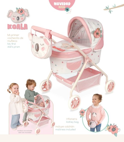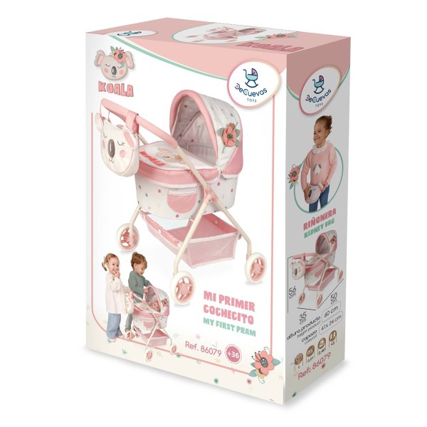 DeCuevas 86079 Môj prvý kočík pre bábiky s taškou KOALA 2024 - 56 cm, z rovnomennej kolekcie, ktorá je novinkou roku 2024, je vďaka nízkej rukoväti, stabilnej konštrukcii a ľahkej váhe vhodný predovšetkým pre úplne malé slečny. Kolekcia ponúka nielen kočíky, ale aj iné doplnky pre malé slečny a ich bábiky. Táto dievčenská kolekcia KOALA je doslova nežnosť sama. Spiaci medvedík s kvetinou za uškom je veľmi roztomilý. Tento motív sprevádza každý výrobok z kolekcie. V prevedení sa strieda biela s drobnou kvetinovou potlačou s lososovo ružovým jednofarebným materiálom. Nádherný španielsky dizajn, precízne spracovanie. Veľmi jednoduchá manipulácia počas samotnej hry. Materiál: kov, plast, textil. Balené v krabici vo farbách kolekcie. Odporúčaný vek od 3 rokov.