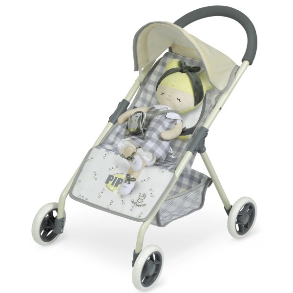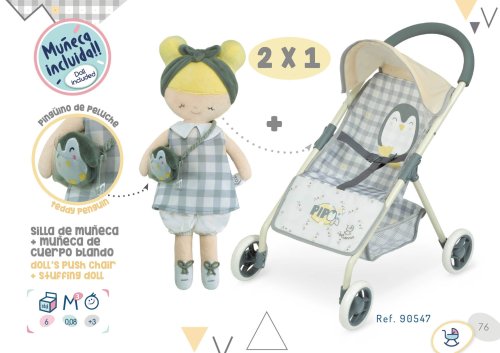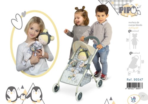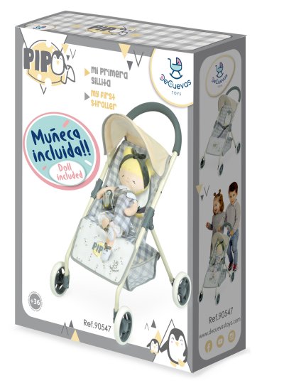 DeCuevas 90547 Športový kočík pre bábiky a plyšová bábika PIPO 2022 - 55 cm, z rovnomennej kolekcie, ktorá je novinkou roku 2022, je vďaka nízkej rukoväti a váhe skôr vhodný pre malé a menšie slečny. Kolekcia ponúka okrem rôznych druhov kočíkov a nábytku pre bábiky aj ďalšie doplnky pre budúce gazdinky. Charakteristická je pre túto kolekciu šedobiela kocka v kombinácii s jednofarebnými šedivými a bielymi nadrobno vzorovanými časťami a doplnkami v jemne žltej farbe a už spomínaným tučniakom PIPO. Nádherný španielsky dizajn, precízne spracovanie. Skladací model, veľmi ľahká manipulácia počas samotnej hry. Materiál: kov, plast, textil. Balené v krabici vo farbách kolekcie. Odporúčaný vek od 3 rokov.