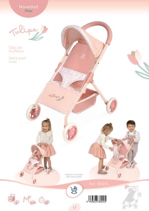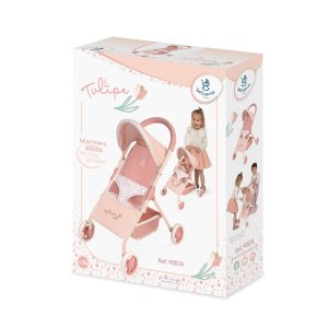 DeCuevas 90574 Športový kočík pre bábiky Tulipe 2025 - 55 cm patrí do rovnomennej kolekcie, ktorá je novinkou roku 2025 a ponúka výber výrobkov od jedálenských sád cez postieľky a kočíky až po drevený nábytok pre bábiky. Tulipe je, ako už sám názov napovedá, kolekcia plná tulipánov v prekrásne zladených teplých pastelových lososových farbách. Svetlejšie a tmavšie odtiene farieb sú vkusne doplnené drobným kvetinovým vzorom v rovnakých tónoch na bielosmetanovom podklade. Tento motív ešte navyše u kočíkov umocňujú svojim tematickým tvarom aj prekrásne, ako tulipán vyzerajúce tašky. Kvet tulipánu zdobia aj drevené výrobky tejto kolekcie.