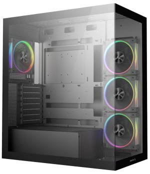 Počítačová skriňa CG580 4F V2 predstavuje jedinečné riešenie pre nadšencov, ktorí chcú svoj hardvér vystaviť na obdiv. Vďaka konštrukcii bez A-stĺpika a kombinácii sklenených panelov na prednej a bočnej strane získate panoramatický 270 ° výhľad na všetky komponenty. Skriňa je vopred osadená štyrmi PWM ARGB ventilátormi – tromi s reverzným prúdením na boku a jedným štandardným vzadu, čo zaisťuje optimálne chladenie a vizuálny efekt.