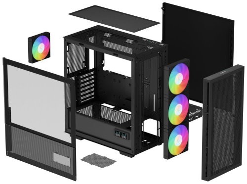 Skriňa formátu Middle Tower s priehľadnou bočnicou ponúka dve 2,5" pozície pre SSD disky a dve 3,5" pozície pre pevné disky. Na hornom paneli sa nachádza jeden port USB 3.0 , jeden port USB-C a kombinovaný port slúchadiel a mikrofónu. Skriňa je vybavená jedným 120 mm ventilátorom na zadnej strane a troma 140 mm ventilátormi na prednej strane. Všetky dodávané ventilátory navyše disponujú ARGB podsvietením . Dômyselné riešenie umožňuje pohodlné umiestnenie až 360 mm dlhého výmenníka vodného chladenia na prednej alebo hornej strane. V skrini je dostatok priestoru pre chladič CPU do výšky až 175 mm a grafickú kartu s dĺžkou 380 mm. Zaiste poteší aj digitálny displej na bočnej strane , ktorý umožňuje sledovať informácie o kritických teplotách CPU alebo GPU. Skriňa je dodávaná bez zdroja .