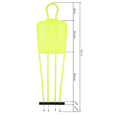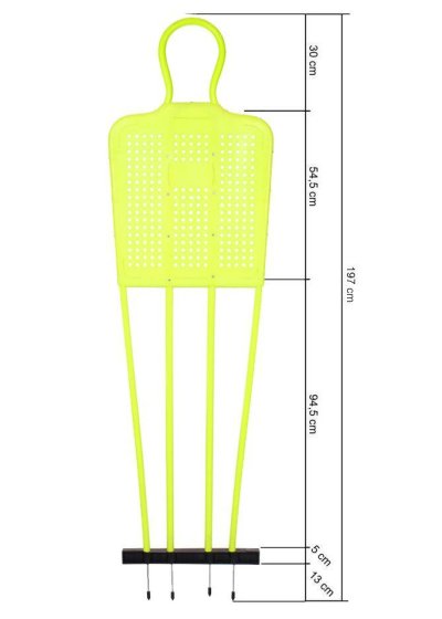 Celoplastová figurína Defence Mannequin s výškou 180 cm a hmotnosťou 3,5 kg slúži na nácvik presnosti priamych kopov, nácvik herných situácií pri zahrávaní trestných kopov a zároveň aj ako tréningová pomôcka pre futbalových brankárov pri týchto situáciách. Tréningová figurína Defence Mannequin vo výraznej neónovo žltej farbe je vybavená štyrmi oceľovými 13 cm dlhými bodcami pre stabilné ukotvenie do trávnatého ihriska. Táto užitočná pomôcka by mala byť súčasťou tréningovej výbavy každého futbalového klubu. Na používanie figuríny na umelom, alebo inom pevnom povrchu môžete zakúpiť stojan Defence Mannequin Base. Podrobné rozmery tréningovej figuríny nájdete vo fotogalérii.