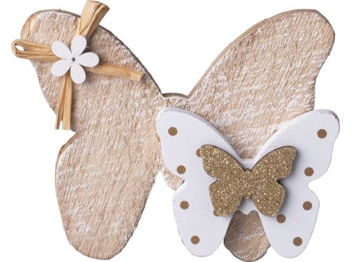 Táto drevená dekorácia motýlika v prírodnej bielej farbe s jemným glitrovým akcentom prinesie do vášho interiéru kúsok elegancie a jarného kúzla. Ideálne na ozdobenie stola alebo ako súčasť kvetinových aranžmánov. Ich veľkosť je 120x100mm.