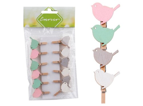 Táto sada drevených kolíčkov s vtáčikom je roztomilým doplnkom pre jarné dekorácie. Každý kolíček je zdobený malým vtáčikom a prináša do vášho priestoru sviežu a hravú atmosféru. Ideálne pre kvetinové aranžmány alebo ako ozdoba na darčeky. Ich veľkosť je 25x35 mm. Tovar je dodávaný v mixe. Doručovaný tovar je vyberaný náhodne a nie je možné vybrať konkrétne prevedenie.