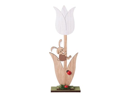 Dekorácia drevo 100x290mm tulipán so zajačikom, prírodná, biela, hnedá