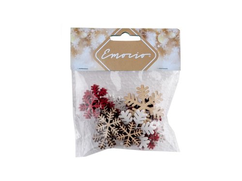 Dekorácia drevo 15 ks 35x40/23x25mm vločky, prírodná, červená, biela