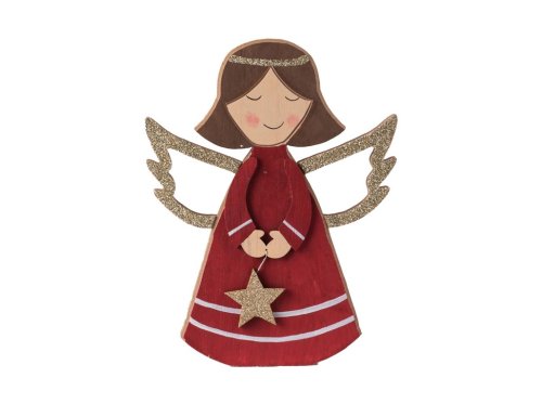 Dekorácia drevo 150x195mm, anjel na postavenie, červená s glitrom
