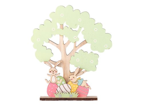 Dekorácia drevo 190x225mm strom so zajačikmi a vajíčkami, prírodná, farebná