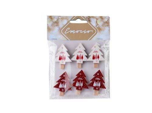 Dekorácia drevo 6 ks 50x36 mm stromček na kolíčku, biela, červená