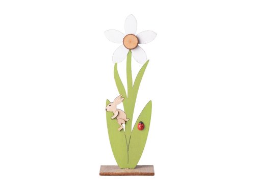 Dekorácia drevo 75x220mm kvietok so zajačikom, biela, zelená, prírodná