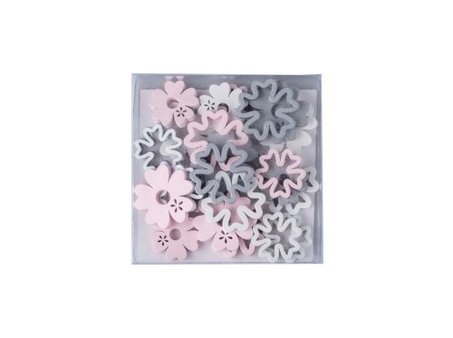 Drevená dekorácia v tvare kvietky, dostupná v niekoľkých farbách. Jej rozmery sú 35 x 35 mm a 27 x 27 mm. Tovar je dodávaný v mixe. Doručovaný tovar je vyberaný náhodne a nie je možné vybrať konkrétne prevedenie.