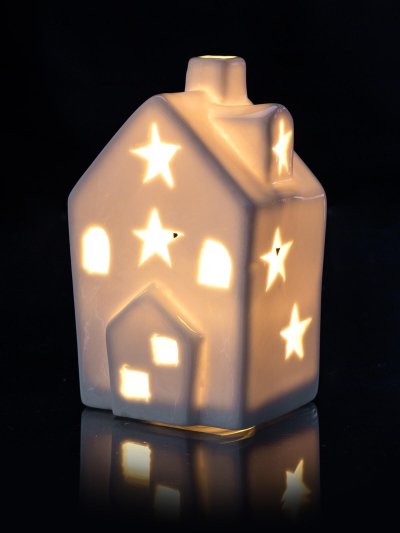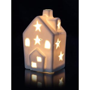 Domček LED s bielym svetlom, var. 1, vyrobený z porcelánu v bielej farbe je krásna dekorácia do vášho interiéru. Dekoratívne domčeky s mihotavým bielym svetlom vytvárajú príjemnú atmosféru. Mihotavé svetlo napodobňuje svetlo horiacej sviečky. Obsahuje batérie a LED žiarovku.