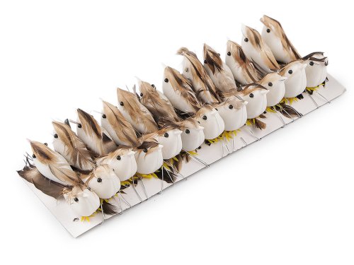 Dekoračný vtáčik je vyrobený z plastu a jeho telo pokrýva farebné perie. Na nohách má pripevnené dva kovové drôtiky, vďaka ktorým môžete vtáčika pripevniť napríklad na veniec, vetvičku, záclonu alebo ho naaranžovať do kvetinových väzieb. Vtáčiky po 24 kusoch sú balené v papierovej krabici.