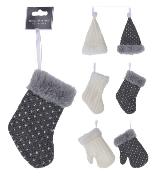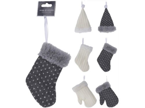 Dekorácia závesná mix RUKAVICA / PUNČOCHA / ČIAPKY, 15 cm, BÍ, ŠE.