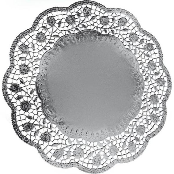 Dekoratívna čipka okrúhla, strieborná. Priemer 36 cm, balenie 4 ks.