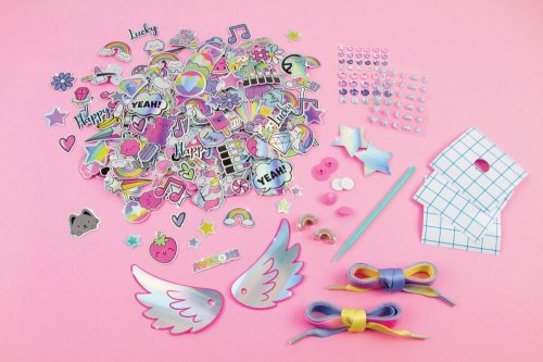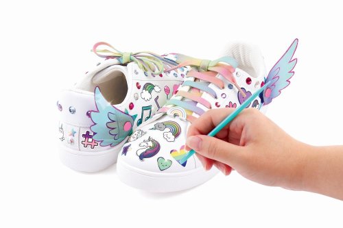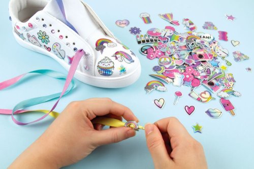 Dočasné tetovanie pre vaše topánky. Dodajte svojej obuvi šmrnc pomocou dekoratívnych samolepiek. Pridajte ich len trochu alebo veľa. Premeňte svoje topánky znova a znova. Zahŕňa korálkové prívesky a šnúrky do topánok. Prebytočné množstvo odstráňte teplou vodou. Vek od 8+.