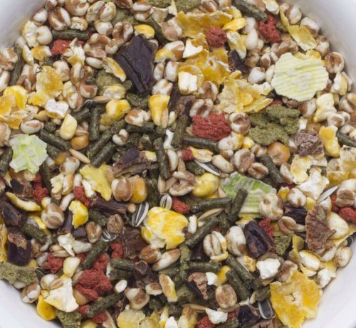 Zloženie: deriváty rastlinného pôvodu (19 % lucerna, 1,5 % lucernová slama), obilniny, zelenina, minerálne látky, semená, oleje a tuky.