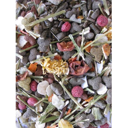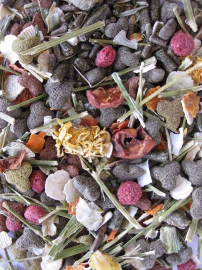 Zloženie: lucerna (14 %), hrachové vločky (10 %), sójové šupky, timotejové seno (9 %), extrudovaná kukurica, ovsené šupky, slnečnicový šrot, extrudovaná pšenica, sušená mrkva (4 %), hrachová vláknina (4 %) , kukuričný škrob, sušené jablko, lucernová slama (3 %), kukurica, sójová krupica, sušená červená repa (2 %), rohovník (2 %), petržlen (1,4 %), extrudovaný jačmeň, seno, slnečnicové semienka, sušený paštrnák (1,04 %) , slnečnicový olej, ľanový olej, uhličitan vápenatý, fosforečnan vápenatý, skorocel (0,2 %), žihľava (0,05 %), ľanové semienko, púpava (0,05 %), echinacea ( 0,05%), extrudovaná ryža, harmanček (0,04%), jahoda listy, oregano (0,03%), kurkuma (0,03%).