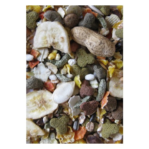 Zloženie: obilniny (1 % proso), vedľajšie výrobky rastlinného pôvodu, zelenina (15,7 %), semená, ovocie (2 % sušený banán), orechy (2 % podzemnica olejná), mäso a výrobky živočíšneho pôvodu, hmyz (1, 5% múčne červy), oleje a tuky, minerály, kvasnice.