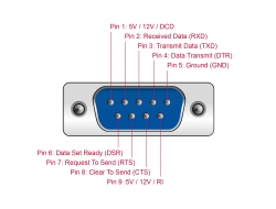 • Signály: DCD/12V/5V, TxD, RxD, RTS, CTS, DTR, DSR, GND, RI/12V/5V