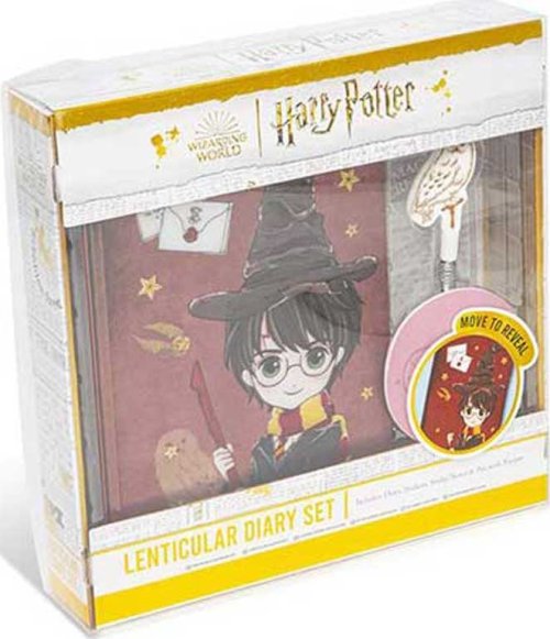 Denník sada Harry Potter Lenticular – vitajte vo fascinujúcom kúzelníckom svete s Denníkom Harryho Pottera! Tento denník vás prenesie do kúzelného sveta Rokfortu a umožní vám znovu prežívať obľúbené okamihy. Sada obsahuje - denník, pero s topperom, samolepiaci bloček a sadu samolepiek.