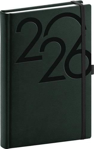 Denný diár Ajax 2026 v tmavo zelenej farbe. Jemne štruktúrovaný povrch s atypickým reliéfom je vhodný pre všetky typy razieb. Diár má zaguľatené rohy, pútko na ceruzku a elastickú gumičku. Denný rozvrh s česko-slovenským kalendáriom a doplnkovou angličtinou, nemčinou, maďarčinou a ruštinou.