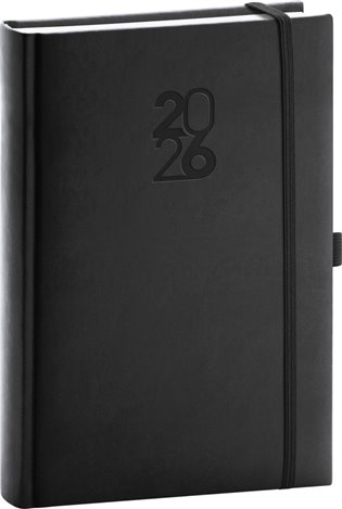 Denný diár Aprint Top 2026 v čiernej farbe. Rozšírenie obľúbeného radu Aprint o variant s gumičkou na zatváranie a pútkom na ceruzku. Denný rozvrh s česko-slovenským kalendáriom a doplnkovou angličtinou, nemčinou, maďarčinou a ruštinou.