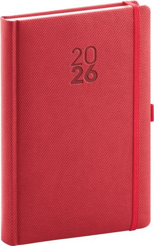 Denný diár Diamante 2026 v červenej farbe. Povrch diára má jemnú štruktúru pripomínajúcu výbrus diamantu a je ideálny pre všetky typy razieb. Diár má zaguľatené rohy, pútko na ceruzku a elastickú gumičku. Denný rozvrh s česko-slovenským kalendáriom a doplnkovou angličtinou, nemčinou, maďarčinou a ruštinou.