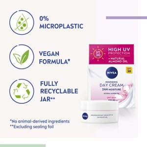 Suchá a citlivá pleť potrebuje špeciálnu starostlivosť, ktorá jej dodá nielen potrebnú hydratáciu, ale aj výživu a ochranu. Tento hĺbkovo vyživujúci denný krém s prírodným mandľovým olejom a Moisture Care komplexom poskytuje okamžitú úľavu od pocitu napätia a zaisťuje hydratáciu až na 24 hodín. Chráni pred stratou vlhkosti, tvorbou šupiniek aj predčasným starnutím vďaka ochrane SPF 30.