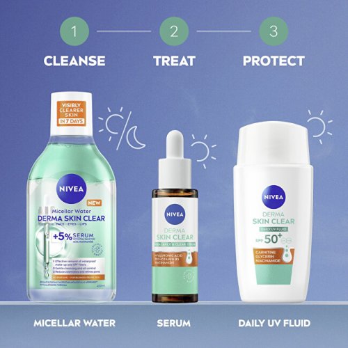 Zbavte sa nedokonalostí a chráňte svoju pleť. Vyskúšajte Nivea denný UV fluid Derma Skin Clear s veľmi vysokou ochranou proti škodlivému UVA a UVB žiareniu s niacínamidom pre hebkú a matnú pleť až na 8 hodín. Absolútna must-have pre problematickú pleť.