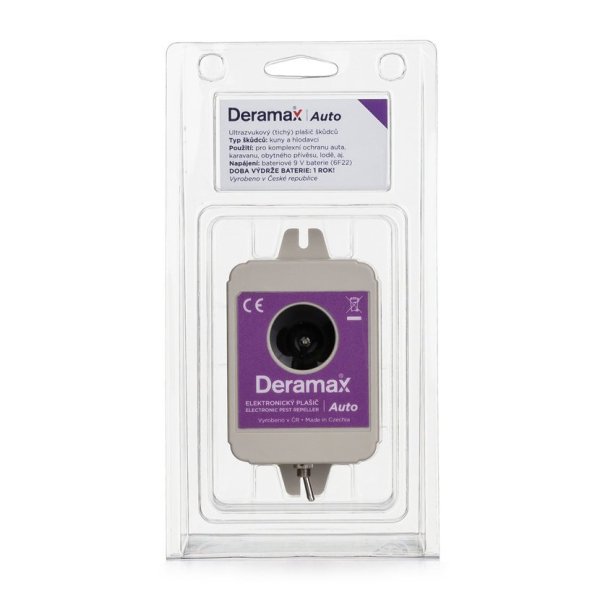 Ako vyplýva z názvu tohto prístroja, Deramax-Auto je odpudzovač hlodavcov a kún do auta, ale prístroj je určený aj na ochranu napr. poľnohospodárskych strojov, karavanov, lodí a pod. Prístroj generuje silné ultrazvukové pulzy špecifického tvaru, ktoré sú pre drobné hlodavce a kuny veľmi nepríjemné, takže po krátkom čase priestor auta opúšťa. Kuna v aute, či hlodavci nie sú prístrojom usmrtení, ani poranení. Pokiaľ teda stojíte pred problémom „ako na kune v aute“ je práve prístroj Deramax-Auto tým optimálnym riešením.