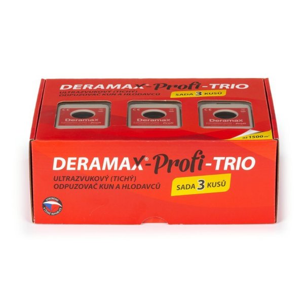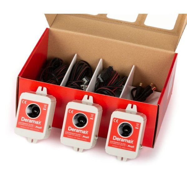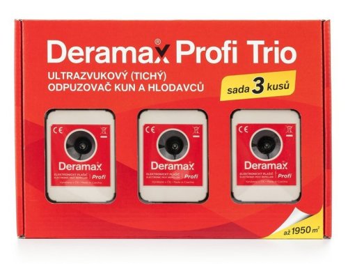 Súprava plašičov Deramax-Profi-Trio je v súčasnej dobe veľmi žiadaným produktom proti kunám a hlodavcom, pretože spĺňa požiadavku mnohých zákazníkov na komplexnú ochranu celého rodinného domu, teda napr. pivnica + prízemie + podkrovie. A ak je celá sada využitá len pre jedno podlažie, dochádza k významnému zvýšeniu efektu proti škodcom oproti využitiu jedného plašiča.