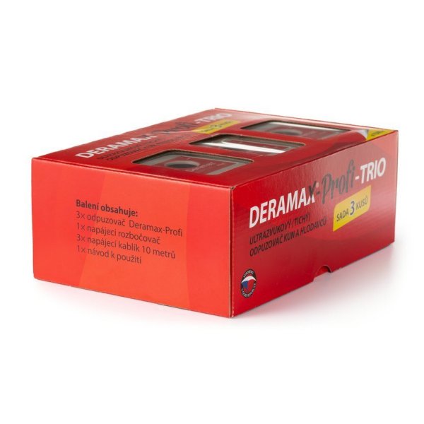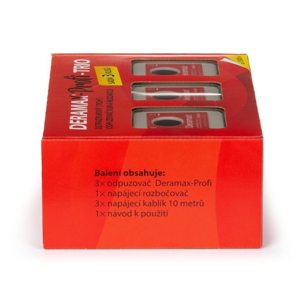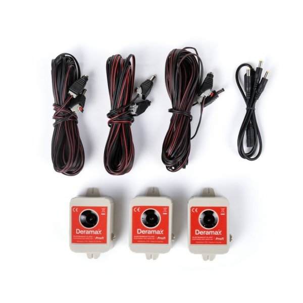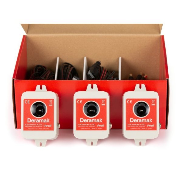 Súprava Deramax-Profi-Trio sa skladá z 3 ks plašičov Deramax-Profi, ktoré sa pripájajú k centrálnemu napájaciemu rozbočovaču pomocou 10 metrov dlhých predlžovacích káblikov. Rozbočovač zlučuje všetky predlžovacie kábliky a pripája ich k centrálnemu napájacími zdrojmi (zdroj nie je súčasťou dodávky).
