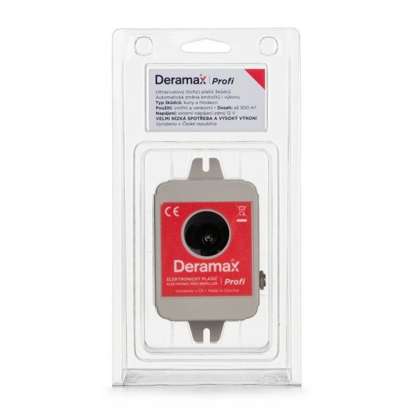Ultrazvukový plašič (odpudzovač) Deramax-Profi je elektronické zariadenie, ktoré slúži na ochranu vnútorných alebo vonkajších priestorov pred kunami, hlodavcami a piscami. Prístroj je úplne bezpečný a bezhlučný ako pre človeka, tak aj pre bežné domáce a hospodárske zvieratá a umožňuje tak bezproblémové využitie aj v obytných priestoroch. Škodcovia sú trvalo obťažovaní ultrazvukovými signálmi plašiča av krátkom čase opúšťa chránený priestor. Nedochádza teda k úhynu škodcov a nevzniká nutnosť odstraňovať uhynuté zvieratá. Prevádzka prístroja je úplne ekologická, bez využitia chemických prostriedkov.
