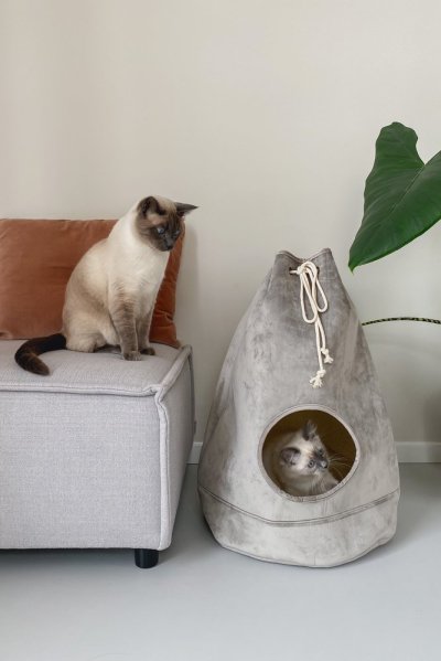 Predstavujeme útulný mačací domček, ktorým Vašej mačke doprajete jej vlastné miestečko k nerušenému odpočinku. Bonusom je to, že sa bude aj krásne vynímať vo Vašom interiéri. Pelech svojím tvarom pripomína vak, ktorý sa zaväzuje šnúrkou. Otvor v prednej časti ponúka ľahký vstup. Súčasťou je mäkký vankúš, ktorý zaistí pohodlie. Vankúšik je možné prať v práčke na 30 stupňov.