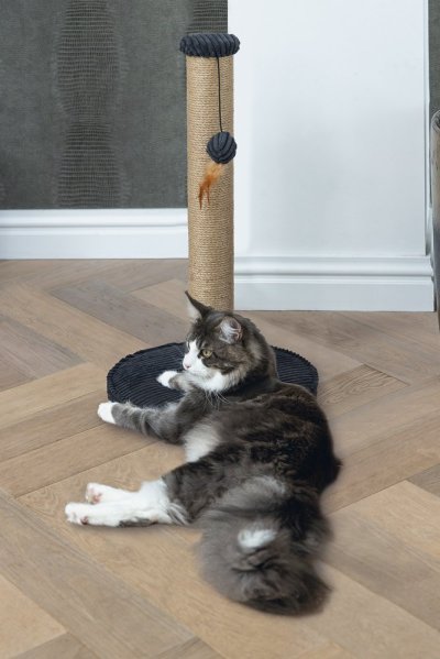 Toto škrabadlo bude nielen užitočné pre Vašu mačku a starostlivosť o jej pazúriky, ale bude aj vyzerať skvele vo Vašej domácnosti. Základňa je potiahnutá luxusnou rebrovanou tkaninou, v ktorej sú vyvedené aj ďalšie detaily. Škrabací stĺpik je omotaný jutovým lanom. Tu Váš maznáčik môže zvisle škrabať do sýtosti a Váš nábytok tak už nebude slúžiť ako škrabadlo. Vďaka zavesenej hračke vo forme loptičky s pierkom je škrabadlo aj neodolateľne zábavné. Skrátka - s týmto škrabadlom urobíte radosť sebe aj svojej mačke.