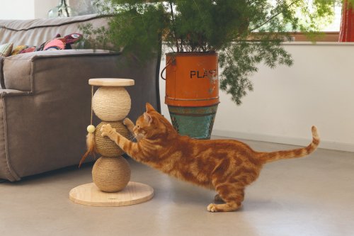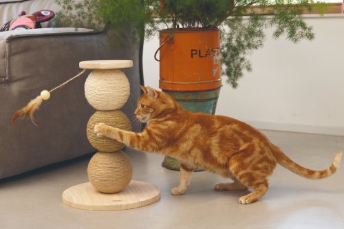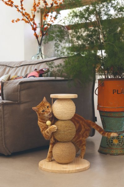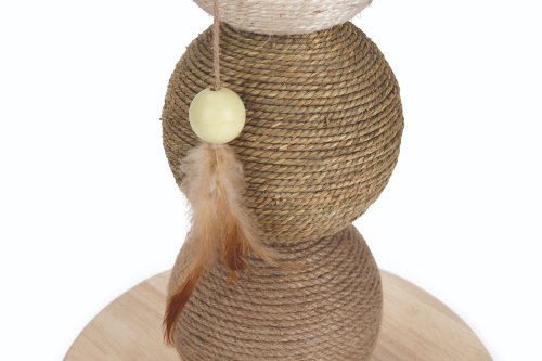Škrabadlo Elio je skutočným dizajnovým kúskom pre Váš domov, s ktorým si Vaša mačka užije veľa radosti zo škrabania! Je vyrobené z kaučukového dreva, ktoré má krásnu, svetlo krémovú farbu. Každá guľa je navyše omotaná iným typom povrazu: jutou, sisalom a morskou trávou. Súčasťou škrabadla je hračka s hracím perím pre extra zábavu! Škrabadlom Elio urobíte radosť nielen Vašej mačke, ale tiež bude vyzerať fantasticky vo Vašom interiéri!