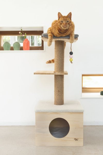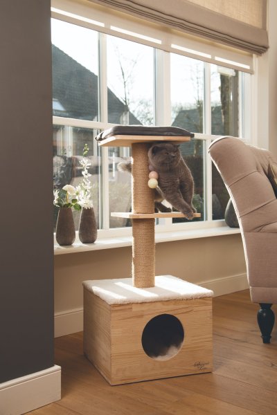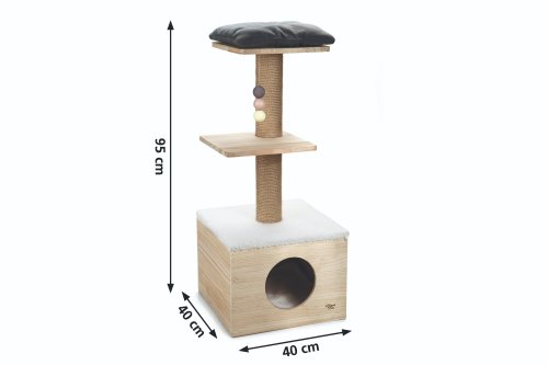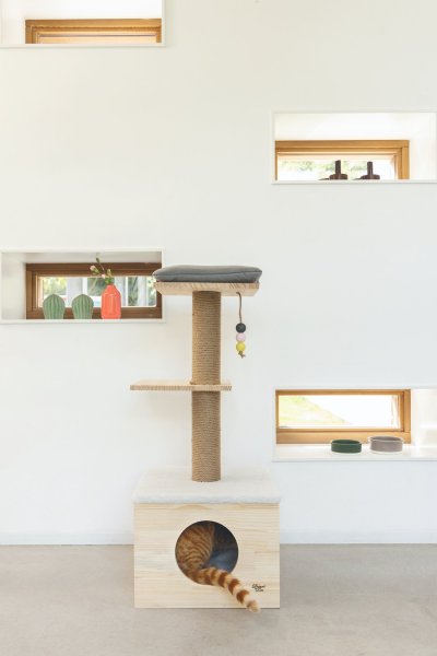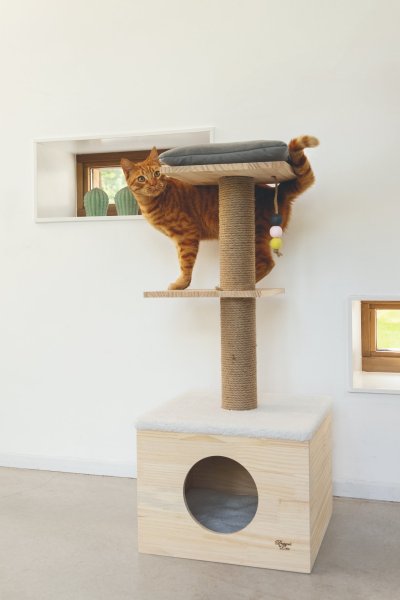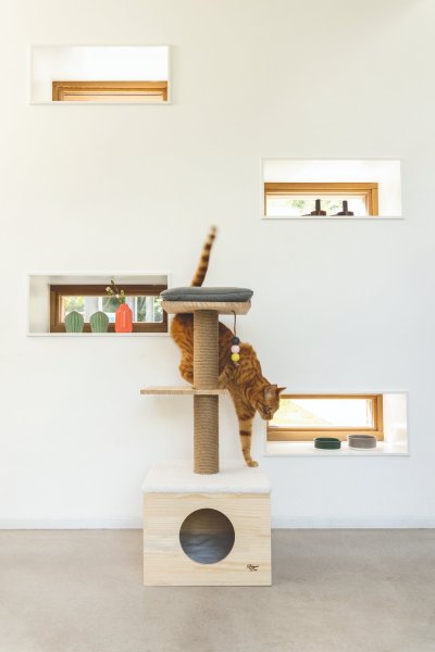 Lezenie, naťahovanie, brúsenie pazúrikov, hranie alebo zdriemnutie? To všetko je možné so škrabadlom Kamina od Designed by Lotte. Vrch domčeka je opatrený mäkkou dečkou a na hornej plošine nájdete vankúšik. Tu si Vaša mačka môže zdriemnuť alebo len na všetko v pokoji dohliadať. V spodnej časti stĺpika je útulný domček pre pohodlný a ničím nerušený odpočinok. Škrabací stĺpik je omotaný sisalovým lanom, takže Váš maznáčik môže uspokojiť svoju prirodzenú potrebu škrabania do sýtosti. Súčasťou je aj hračka vo forme zavesených loptičiek.