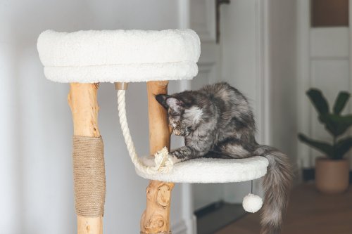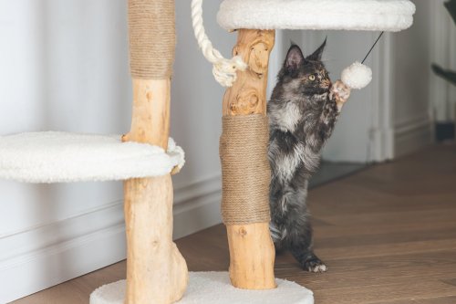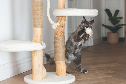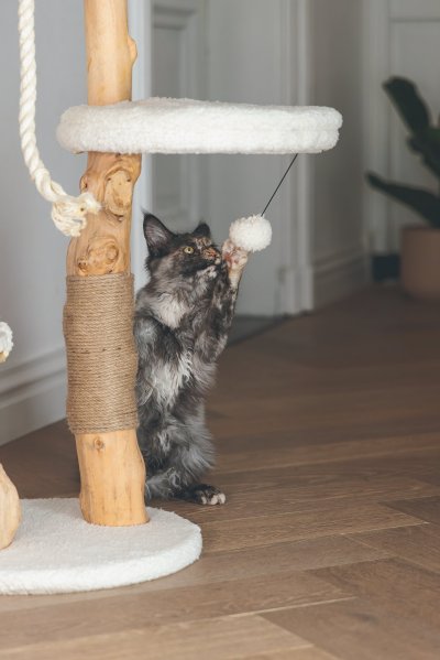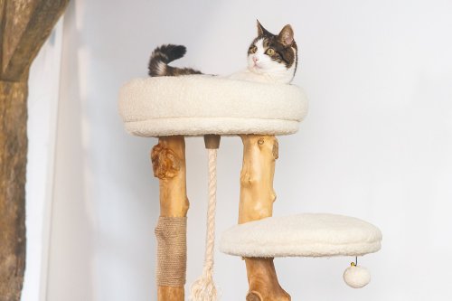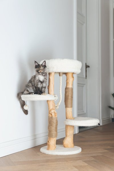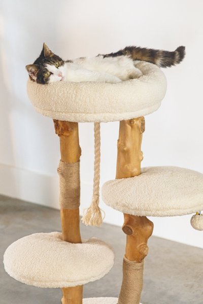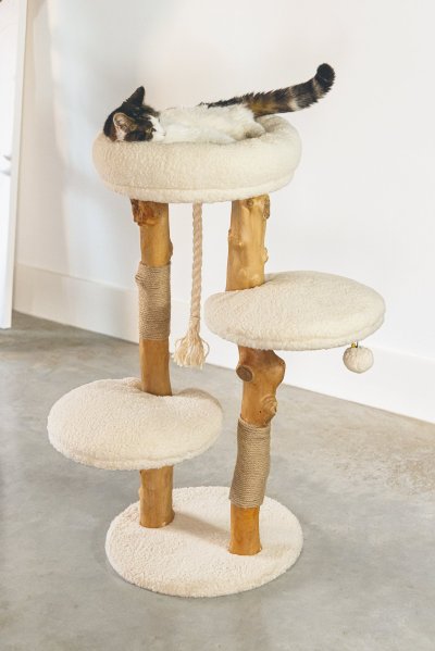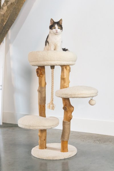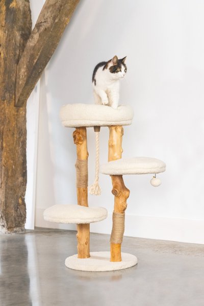 Vanja od Designed by Lotte medzi ostatnými škrabadlami okamžite zaujme. Je vyrobené z datľového a hruškového dreva, ktoré dodávajú škrabaciemu stromu jedinečný prírodný vzhľad. Vďaka tomu bude škrabadlo vyzerať krásne vo Vašom interiéri. V hornej časti tohto škrabadla nájdete mäkký pelech z krásnej plyšovej látky. Vaša mačka môže v tomto mačacom košíku odpočívať, zatiaľ čo má z vyvýšeného miesta dokonalý prehľad. To je niečo, čo mačky naozaj radi. Môže tiež leňošiť na ďalších dvoch plošinách. Ako pridaný herný prvok ponúka škrabadlo jutové lano, ktoré podporuje starostlivosť o pazúriky a hraciu loptičku. Škrabadlo Vanja bude nielen krásnym kúskom nábytku vo Vašom interiéri, ale bude aj funkčné a pohodlné pre Vášho maznáčika. Poťahy relaxačných priestorov je možné sňať a prať na 30 stupňov.