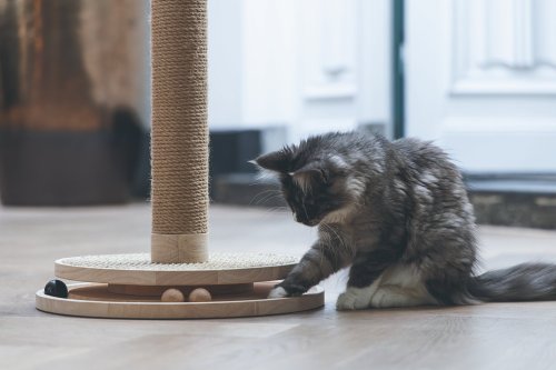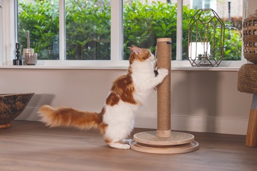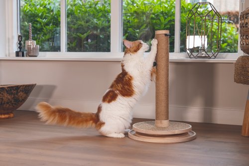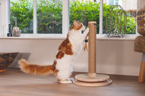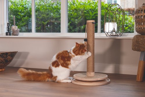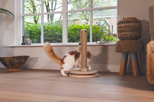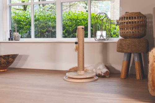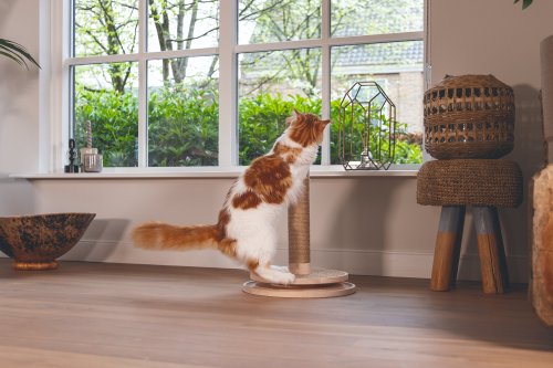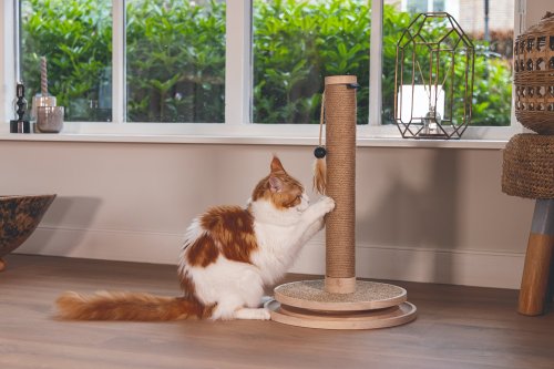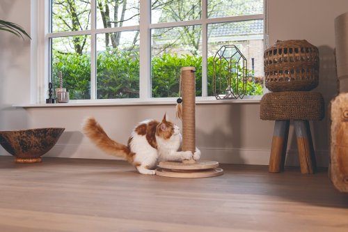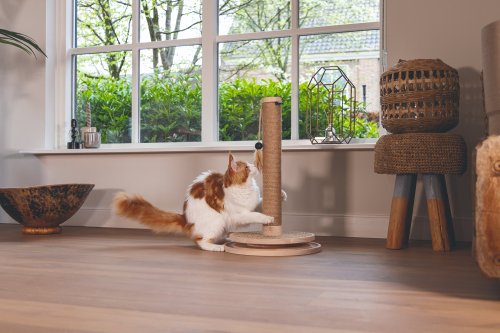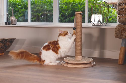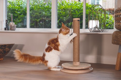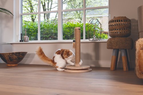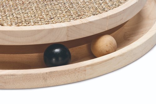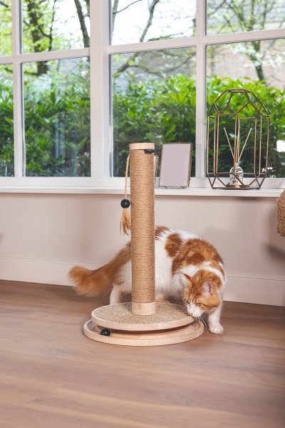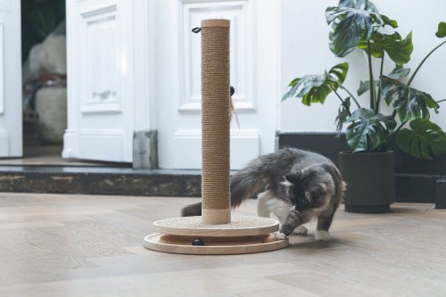 Škrabadlo Zavi od Designed by Lotte prispieva nielen k starostlivosti o pazúriky Vašej mačky, ale zároveň je skvelé aj na hranie. V základni škrabadla sa nachádza zábavná guľodráha s 3 zabudovanými hracími loptičkami. Akonáhle sa Váš maznáčik dotkne guličiek, rozpohybujú sa. K škrabaciemu stĺpiku je navyše pripevnené lanko s pierkom a loptičkou. Aby sa Vaša mačka mohla náležite postarať o svoje pazúriky, je škrabadlo vybavené jutovým lanom. Základňa škrabadla je potiahnutá sisalovou škrabacou podložkou. Kombinácia týchto škrabacích prvkov zaistí možnosť škrabať horizontálne aj vertikálne. Samotné škrabadlo je vyrobené z kaučukového dreva, ktoré mu dodáva krásny, prirodzený vzhľad.
