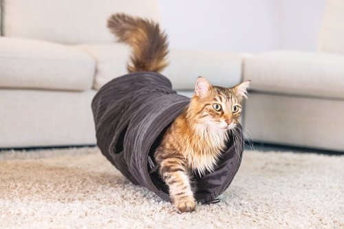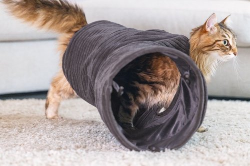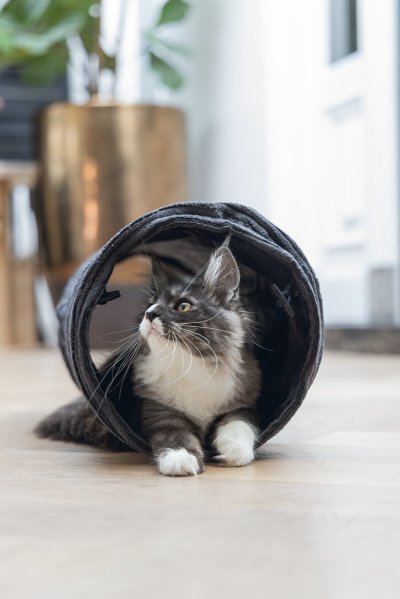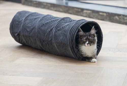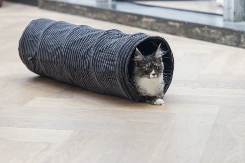Elegantný tunel zaistí hodiny zábavy. Vaša mačka sa bude rada v tuneli schovávať alebo ním prebiehať. Tunel má navyše jeden otvor uprostred. Zabudované kovové kruhy udržujú tunel otvorený a napnutý. Je opatrený krásnou, trendy rebrovanou látkou. Vďaka tomu sa perfektne hodí k najnovším trendom bývania a stane sa krásnym doplnkom Vášho interiéru. Už si Váš chlpatý maznáčik dohral? Potom môžete tunel ľahko zložiť naplocho a uložiť pre úsporu miesta.