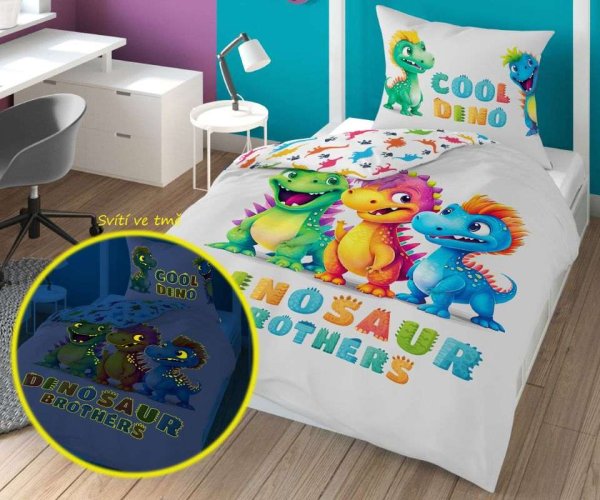 DETEXPOL Obliečky Dinosaur Brothers svietiace 140/200, 70/80 Bavlnené obliečky na veľkú posteľ, zapínanie na zips, obliečky majú z každej strany iný motív, viď. foto, obliečky svietia v tme po nasvietení na dennom svetle, svietiaci efekt sa môže začať vytrácať po 5 vypraniach, možno prať na 40 ° C Materiál: 100% Bavlna Rozmer: 1x 140/200, 1x 70/80 cm