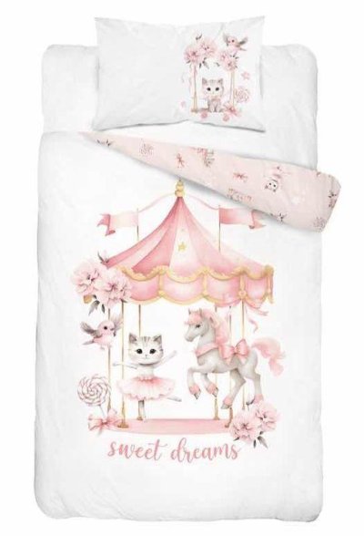 DETEXPOL Obliečky do postieľky Kolotoč 100/135, 40/60 Materiál: 100% Bavlna Rozmer: 1x 100/135, 1x 40/60 cm Detské bavlnené obliečky do postieľky, motív periny je z každej strany iný, zapínanie na zips