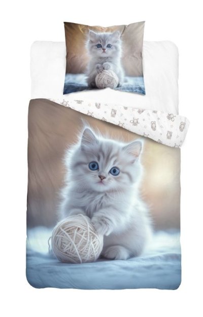 DETEXPOL Obliečky Mačiatko klbko white 140/200, 70/80 Bavlnené obliečky na veľkú posteľ, zapínanie na zips, obliečky majú z každej strany iný motív, viď. foto, pranie na 40 ° C Materiál: 100% Bavlna Rozmer: 1x 140/200, 1x 70/80 cm