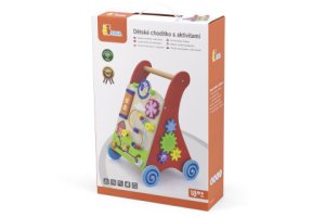 Drevené chodítko s hernými prvkami na rozvíjanie detskej chôdze a motoriky, v slovenskej krabici.