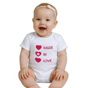 Originálne bavlnené dojčenské body s krátkym rukávom New Baby s nápisom MADE IN LOVE a obrázkom.