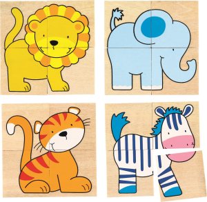 Štvor dielkové puzzle špeciálne vytvorené pre najmenšie deti, ktoré ich zoznamuje s farbami a učí ich pomenovávať zvieratká.