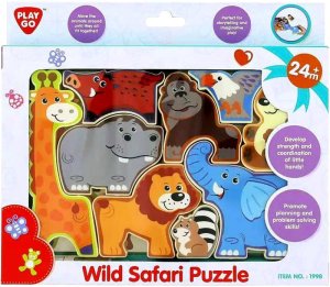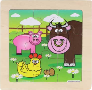 Drevená hlavolamová skladačka s dielikmi v tvare veselých zvieratiek.