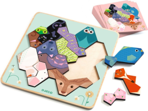 S touto originálnou vzdelávacou hrou sa deti zoznámia so základmi geometrie a priestorového vnímania prostredníctvom obľúbenej témy – zvieratiek. Úlohou je z drevených dielikov skladať siluety podľa predlôh.