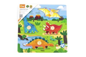 Drevená vkladačka s obrázkami dinosaurov.